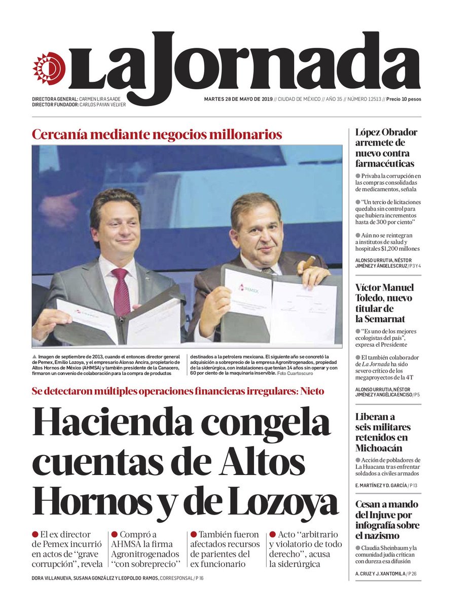 El mismo documento para bloquear las cuentas de la siderúrgica y de su presidente, Alonso Ancira, se usó de la misma manera con Emilio Lozoya Austin, ex director de Pemex, y su esposa, María Helene Ecke –propietaria de Eckes Granini, la empresa de jugos más importante de Europa, que factura alrededor de 3 mil millones de euros al año–, así como las de Gilda Susana Lozoya Austin, hermana del antiguo funcionario, y Rodrigo Arteaga Santoyo, su secretario particular, confirmó a La Jornada Santiago Nieto Castillo, titular de la UIF.